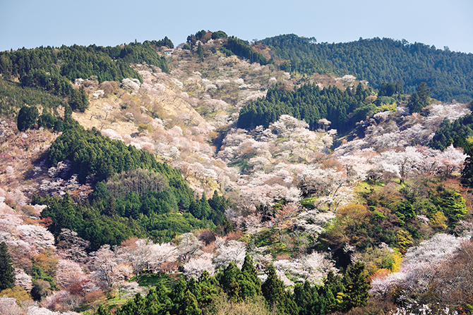 吉野山の谷から尾根を埋める桜はおよそ3万本。下千本(吉野駅付近)から中千本(如意輪寺付近)、上千本(吉野水分神社付近)、奥千本(西行庵一帯)へと花期をずらして順に咲きのぼる様子は壮観です。