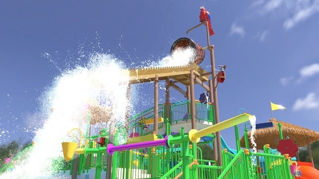高さ13メートルの位置にある直径1.8メートル、高さ1.8メートルのバケツから2300リットルの水が一気に流れ落ちる仕掛けのほか、全長約50メートルのスライダーや、子どもも利用できる5つのスライダー、レバーでひっくり返るミニバケツ、水鉄砲、噴水などを使った70個を超える水遊びギミックを設置した。